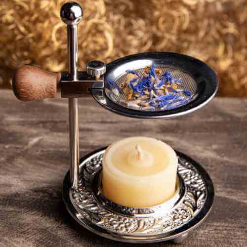 Höhenverstellbares Siebräuchergefäß mit eingravierter Blume des Lebens. Manche Kräuter brauchen etwas mehr Abstand zum Teelicht als andere. Auch Harze reagieren je nach Härte unterschiedlich. Mit diesem Siebräuchergefäß kann man die Höhe je nach Bedarf variieren und gerne auch experimentieren.